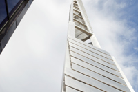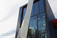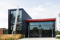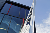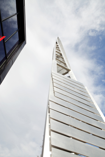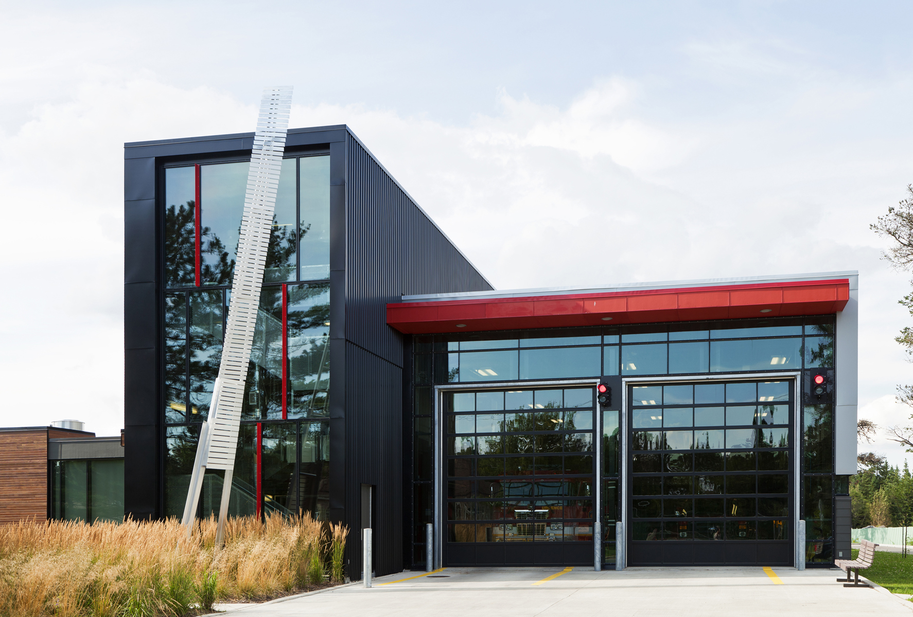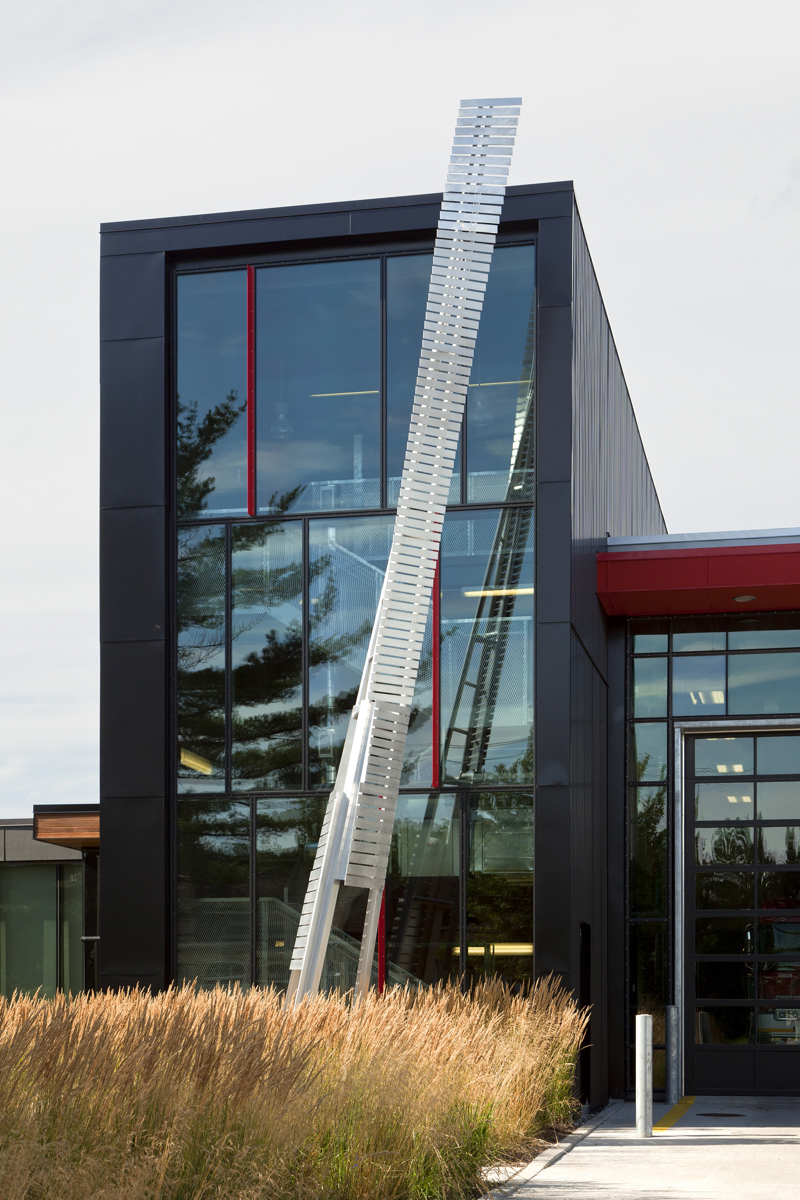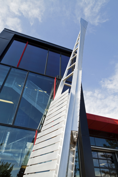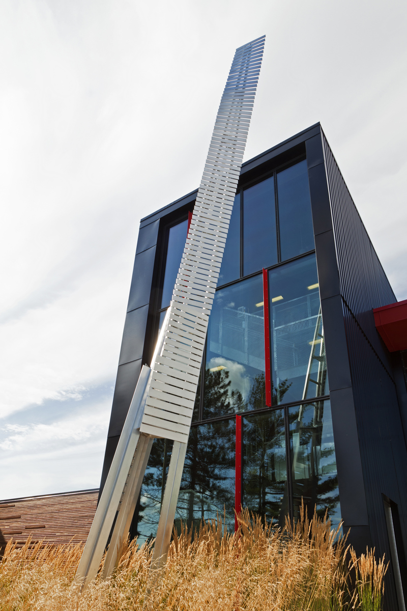 Cette sculpture épurée, composée de plaques d’aluminium soudées, s’intègre parfaitement à l’architecture de la caserne de Val-Bélair. Sa forme élancée, tel un long jet d’eau, la lumière qui joue sur les plaques selon l’heure du jour, le reflet de sa silhouette dans la verrière, tout concourt à créer une impression de dynamisme.