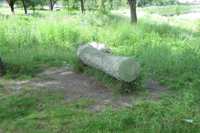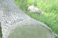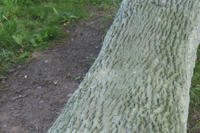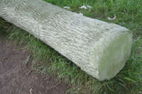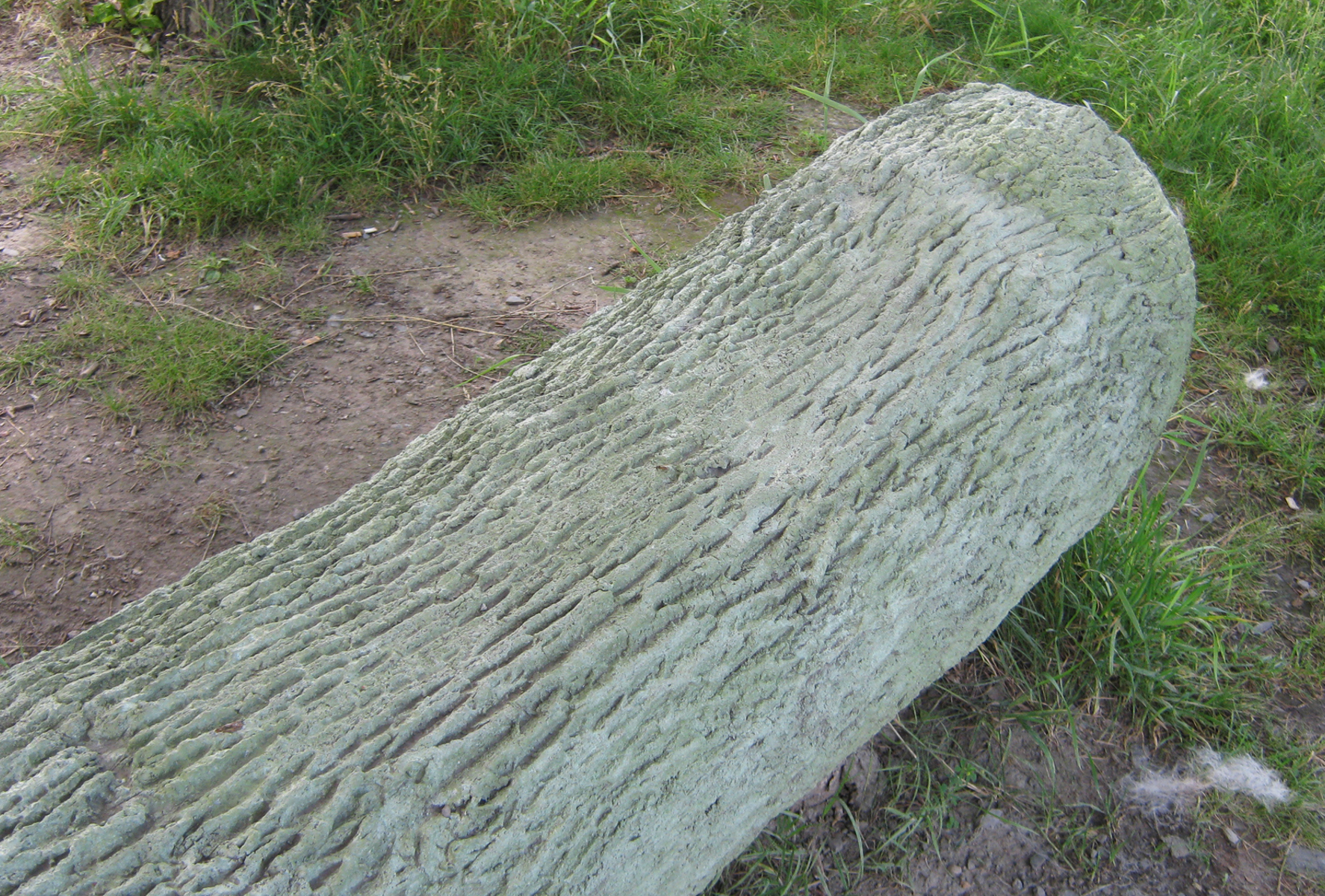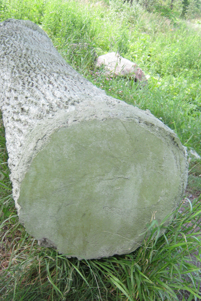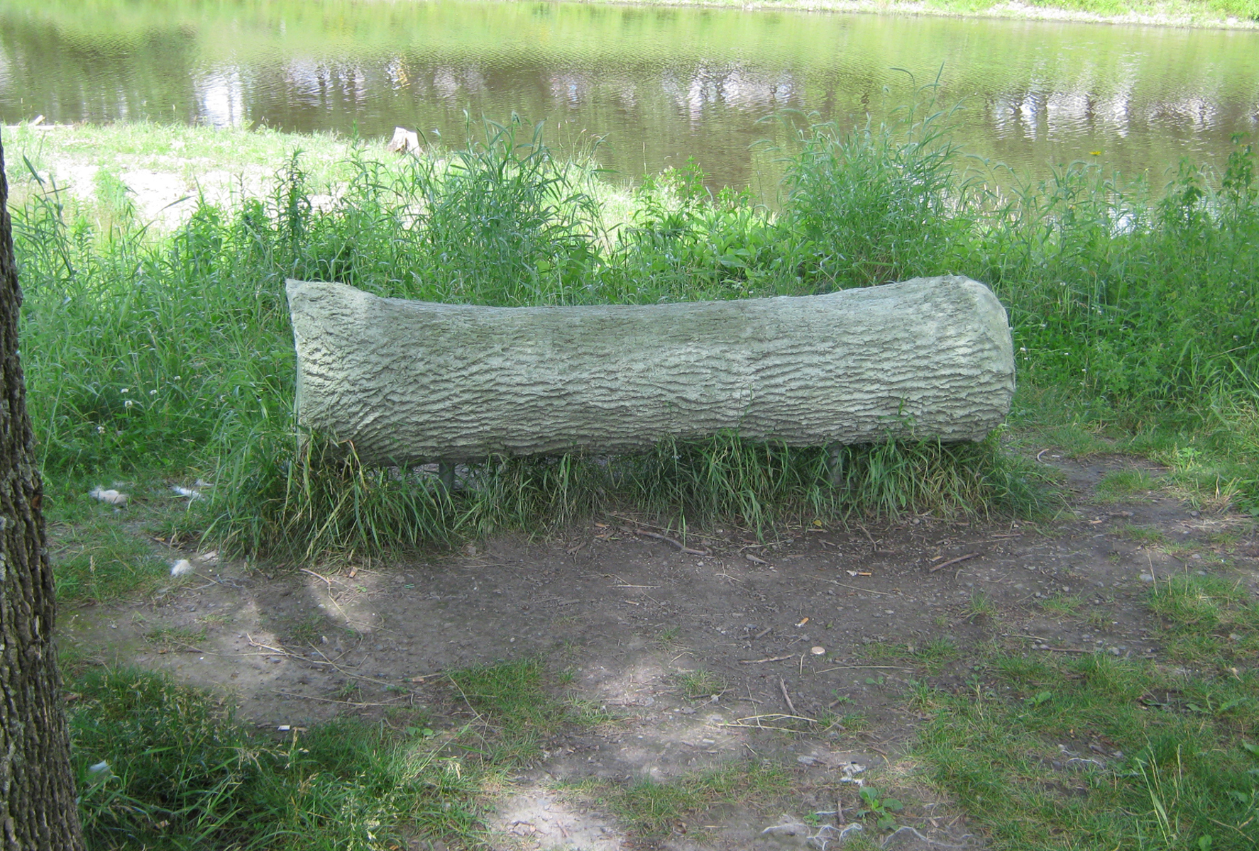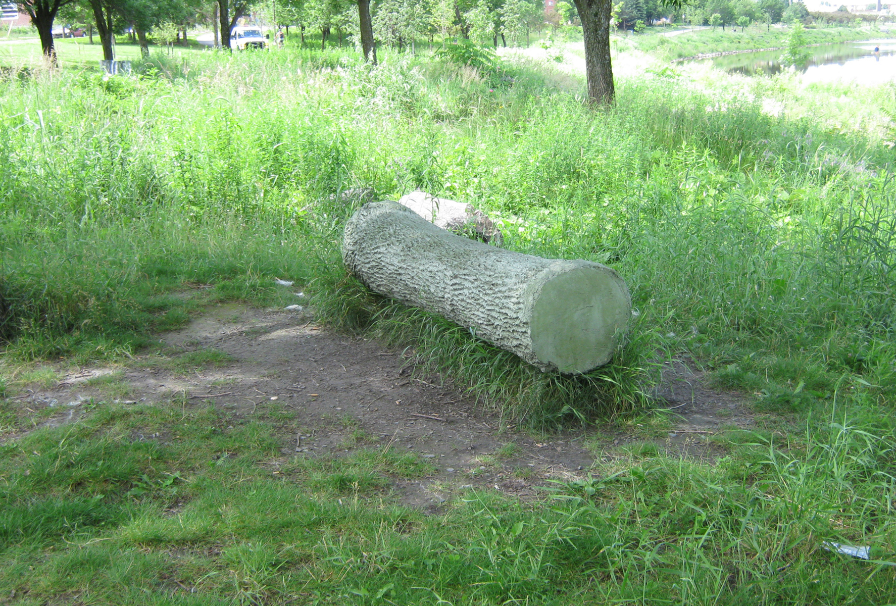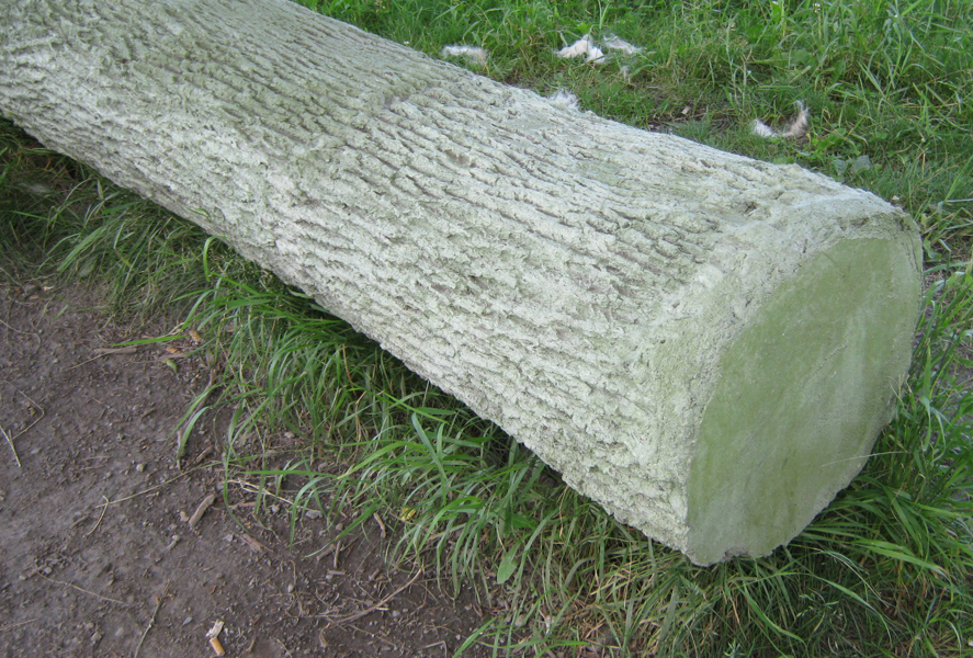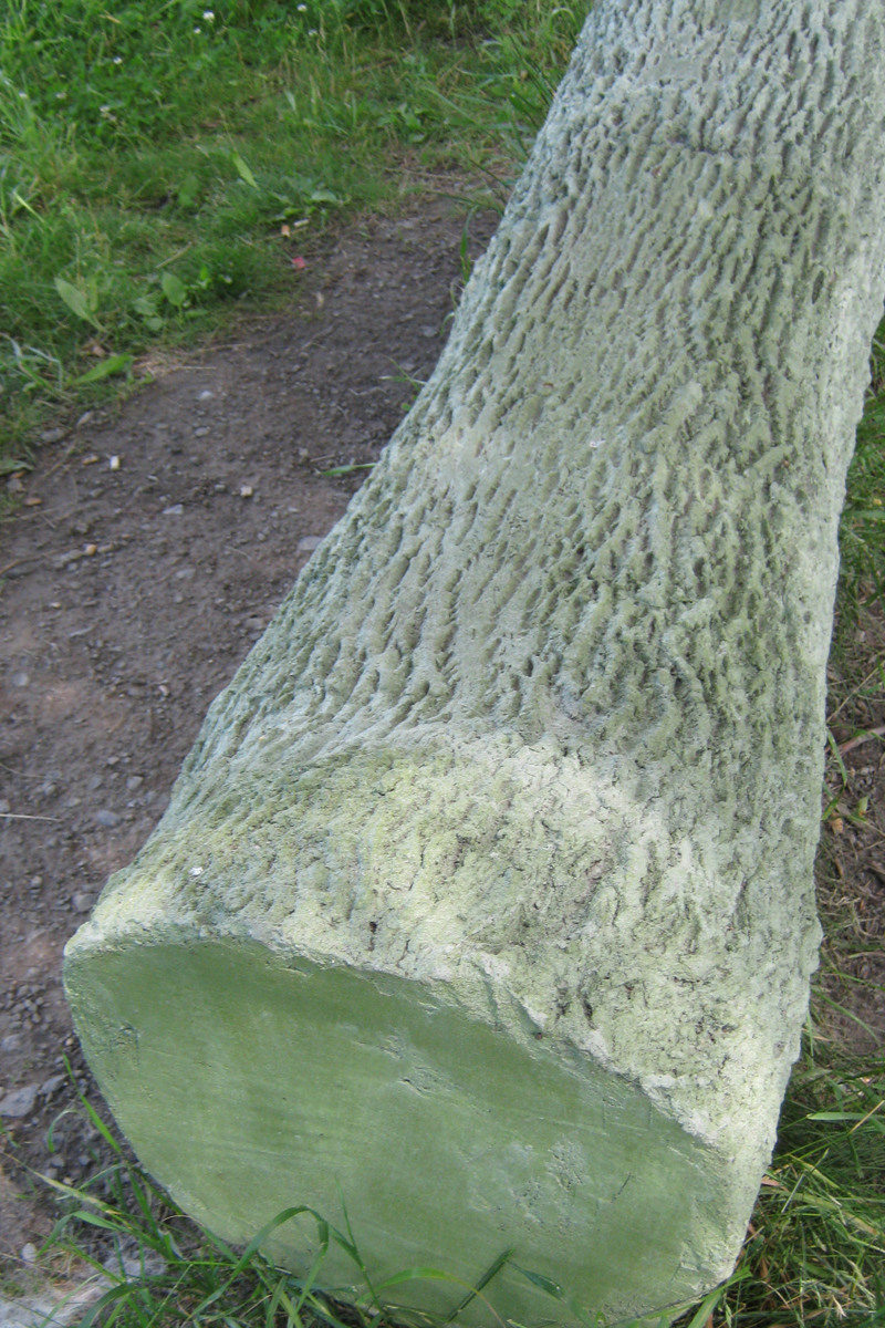 Cette sculpture-banc en béton côtoie un frêne dont elle reproduit le tronc à un moment de sa croissance. Elle le fige dans le temps tandis que le modèle vivant, tout près, continue de se développer au gré des saisons. Le marcheur se trouve ainsi en présence de différentes temporalités : la rivière qui suit son cours, le frêne qui croît d’année en année, la pause bienvenue au milieu de la promenade.