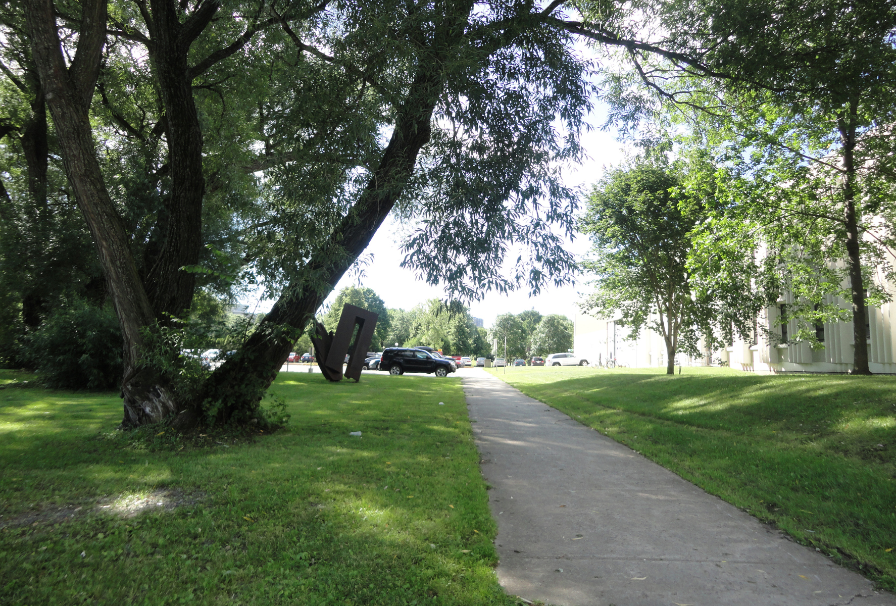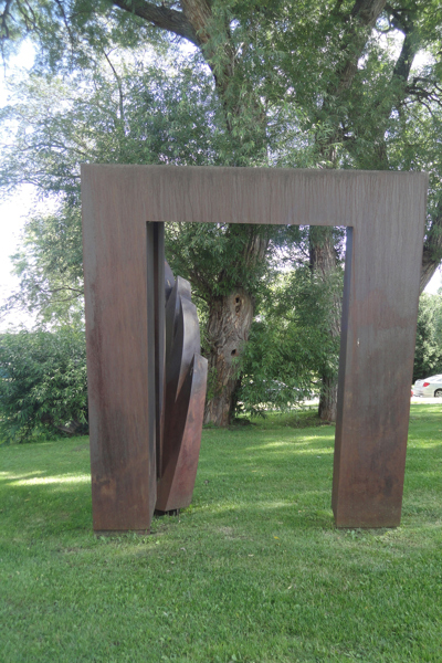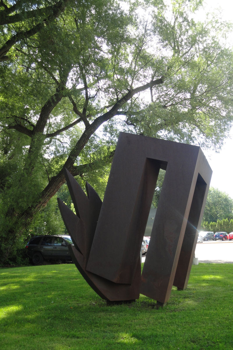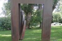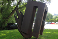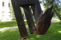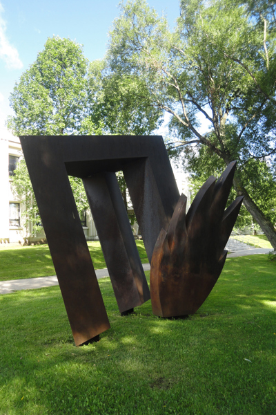 Deux modules en équilibre instable figurent les tensions qui opposent l’être humain et la nature. Évocation de la vie et de la spiritualité, la flamme jaillit du sol pour soulever une table triangulaire qui, elle, renvoie à la raison et à l’architecture.