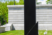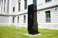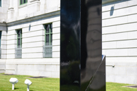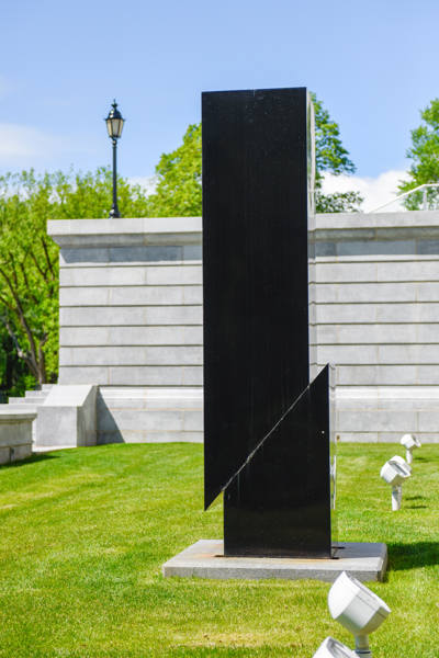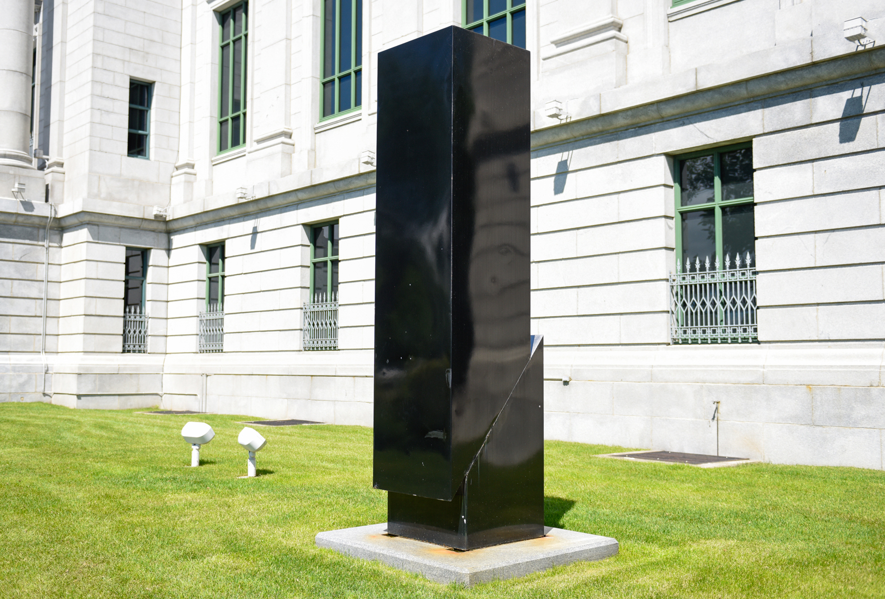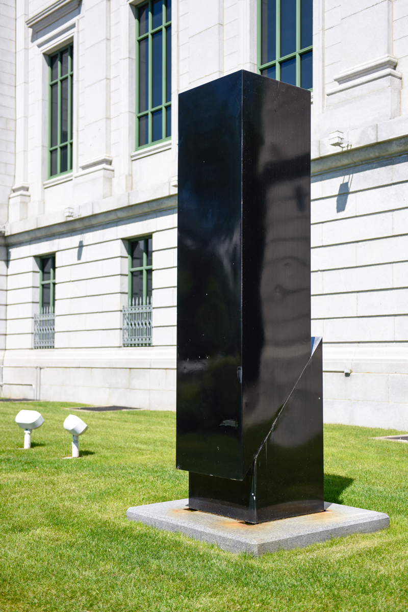 La pureté des formes géométriques crée dans l’espace des jeux harmonieux de tension et d’équilibre. Cette sculpture est l’illustration éloquente d’une dualité : la stabilité des axes verticaux, opposée à l’effet de glissement, de déséquilibre, suggéré par la découpe en diagonale dans le corps monolithique.