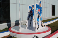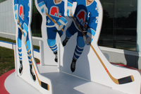 Issus du quartier Saint-Sauveur à Québec, les artistes Pierre Brassard et Marie-Pier Lebeau forment le collectif Pierre&Marie. Ils privilégient les œuvres qui rapprochent l’art du public en abordant de manière ludique différents thèmes sociaux et économiques. Dans Toucher la cible, ils présentent notre sport national comme un phénomène culturel. Les frères Stastny sont mis en scène au milieu d’un jeu de hockey sur table, un divertissement populaire dans les années 1980, à l’époque de gloire du trio. Marian, Peter et Anton y évoluent dans leur position usuelle : ailier droit, centre et ailier gauche.