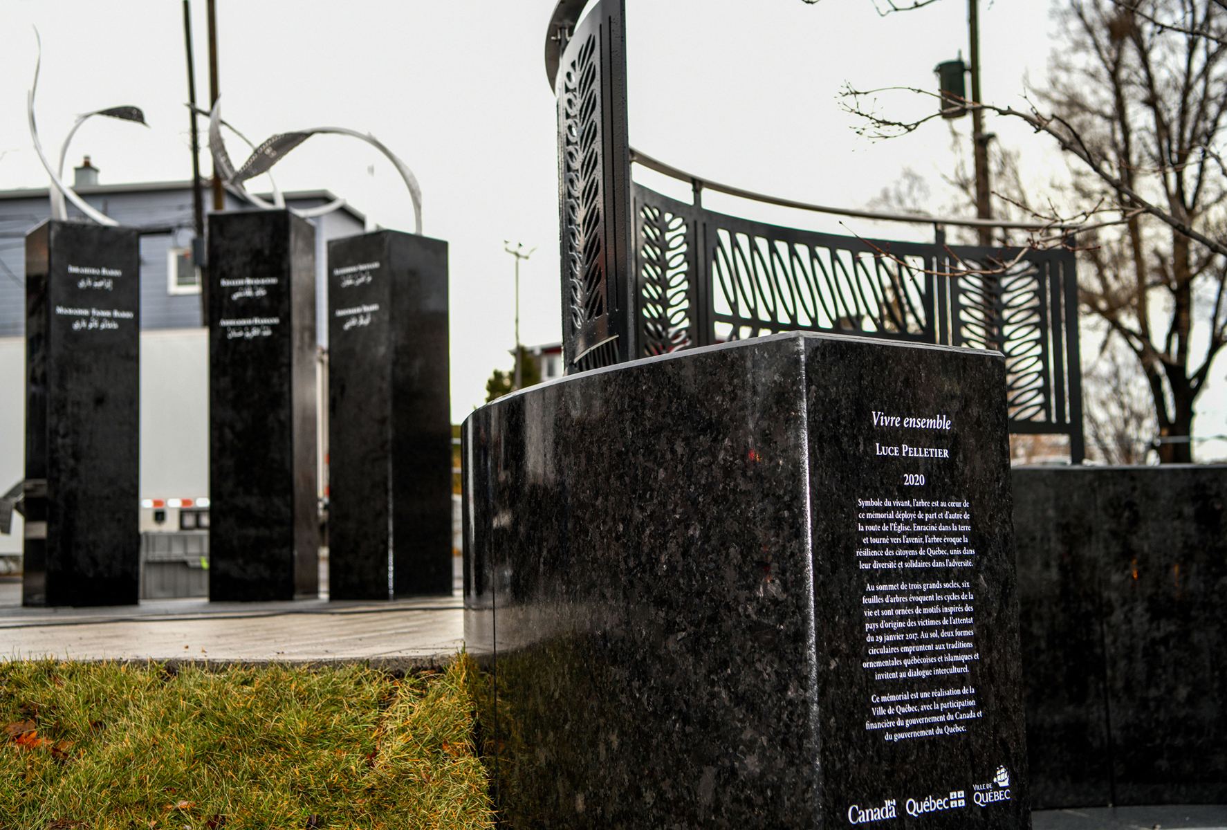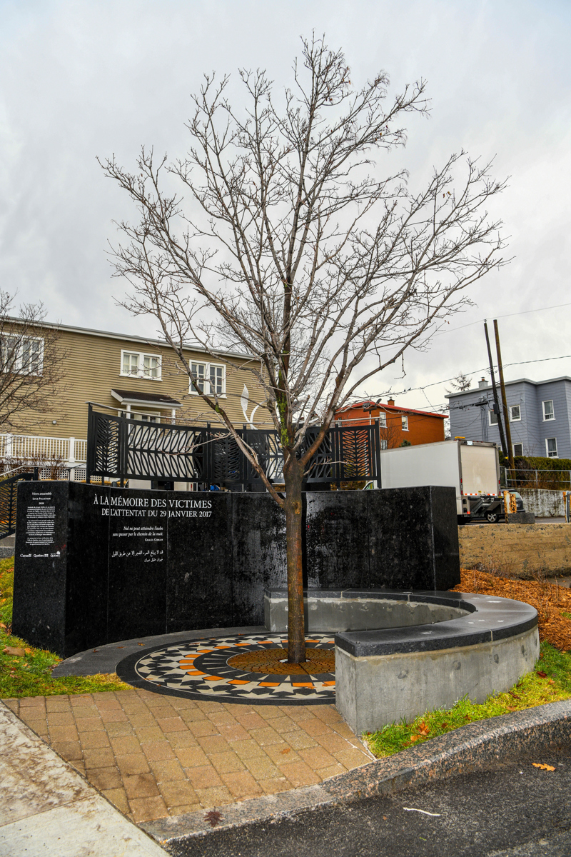 Symbole du vivant, l’arbre est au cœur de ce mémorial déployé de part et d’autre de la route de l’Église. Enraciné dans la terre et tourné vers l’avenir, l’arbre évoque la résilience des citoyens de Québec, unis dans leur diversité et solidaires dans l’adversité.